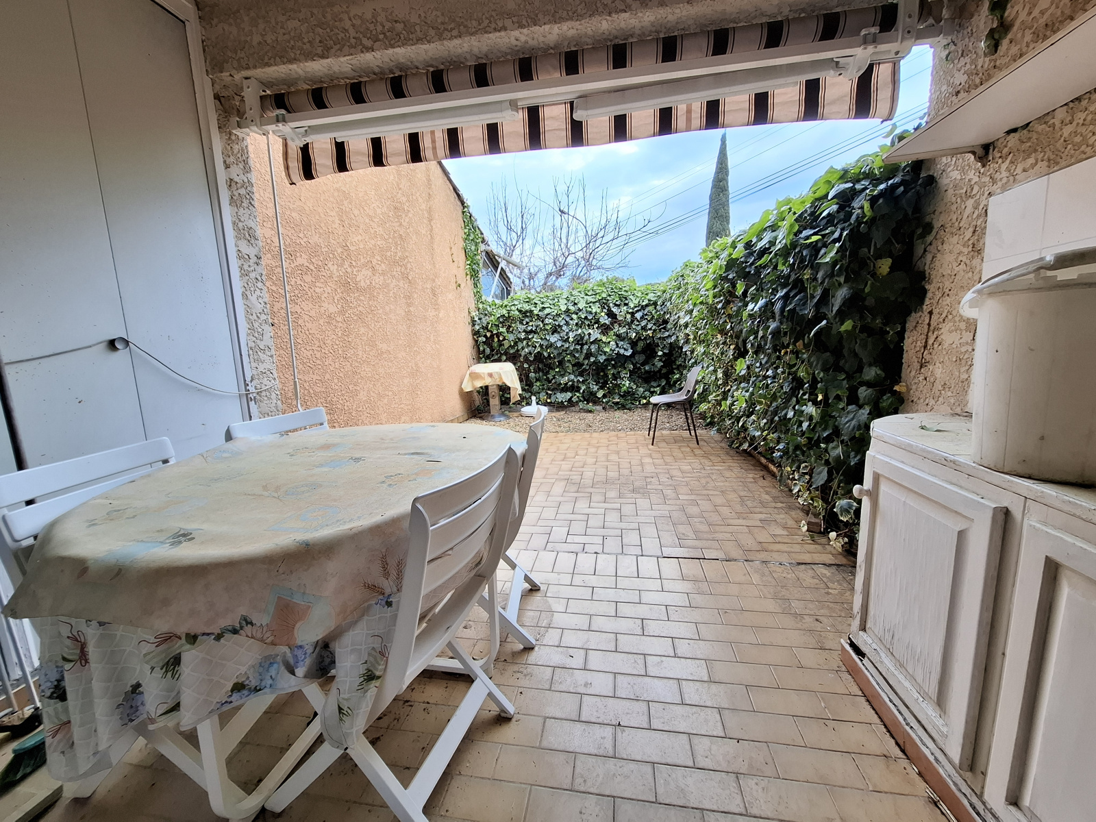 Vous allez apprécier une confortable et accueillante terrasse loggia avec son store banne accessible depuis le séjour.